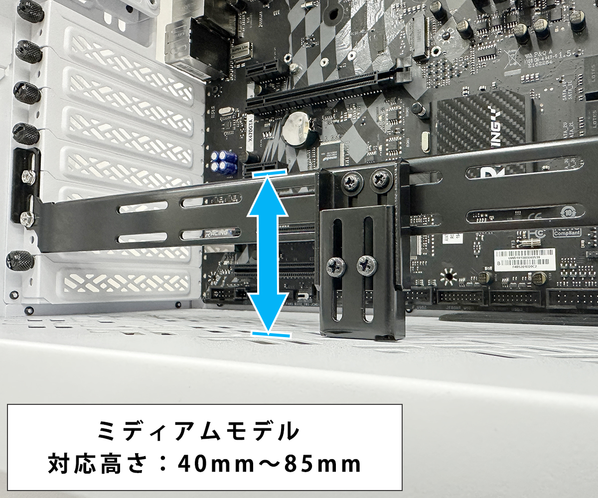 突っ張り式で超重量級のグラフィックボードもガッチリと支えられます。 - 底辺から高さ40mm~85mmまで対応