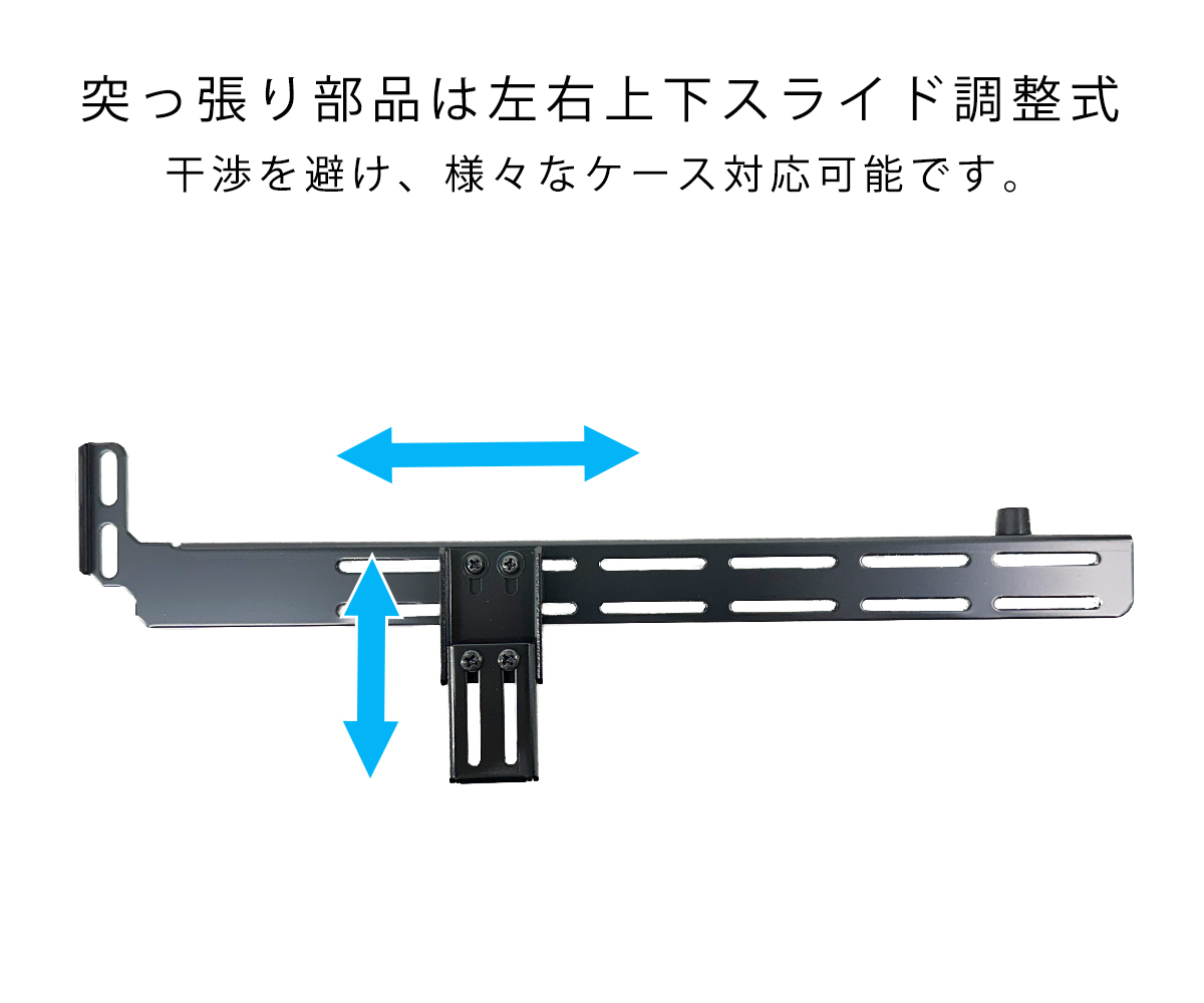 突っ張り位置は可動式で調整(上下)が可能ですのでケース底面にファンが設置してある場合でも極力干渉を避けることが可能です。 - サポートゴムは可動式により任意の位置で支えることが可能
